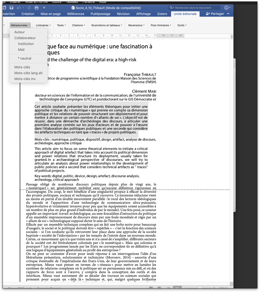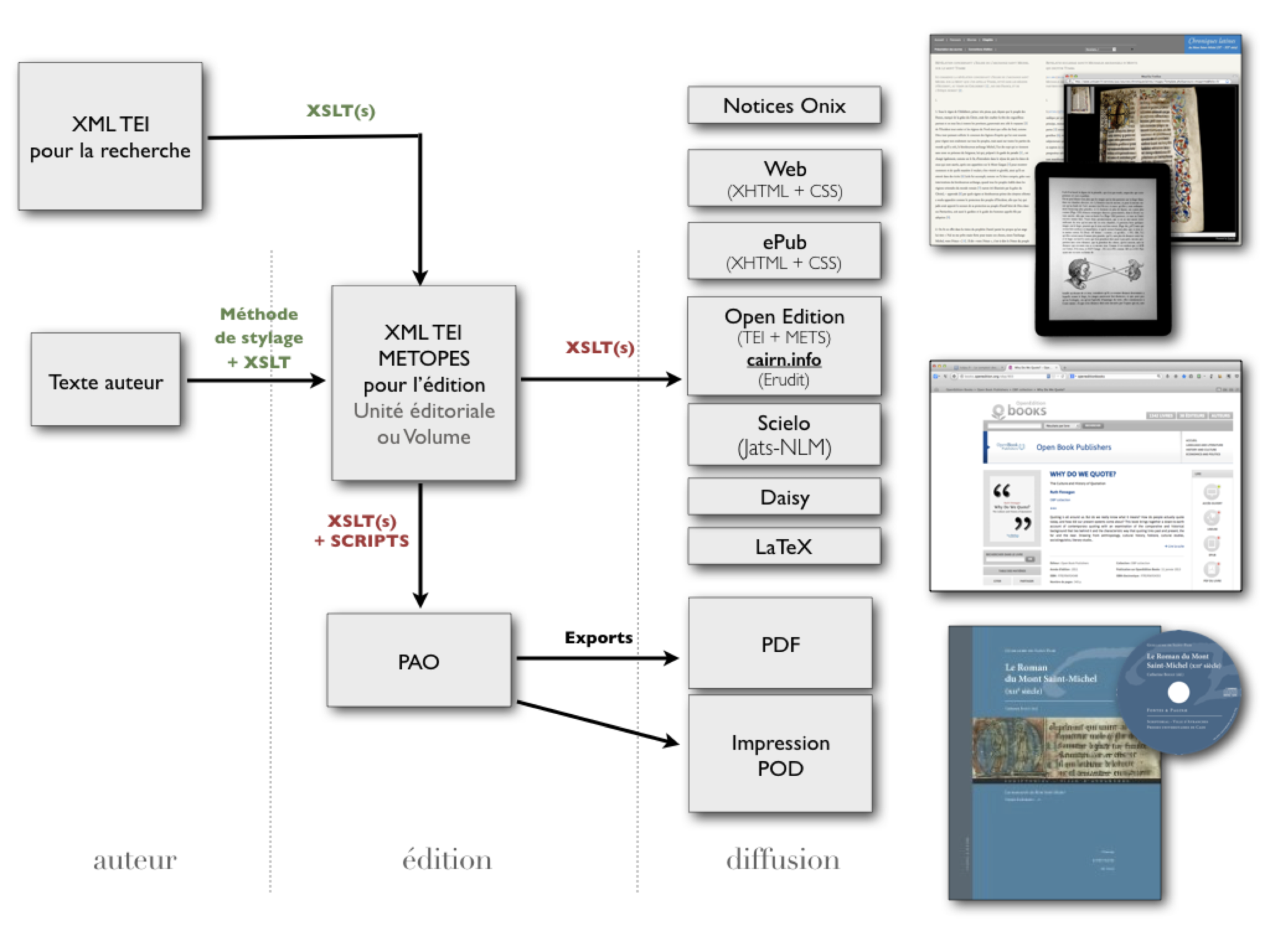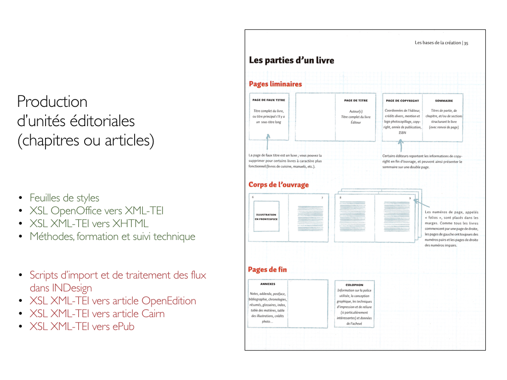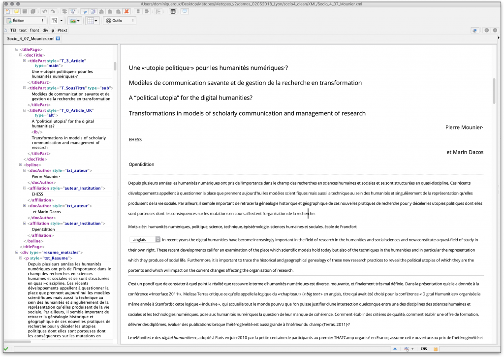 [5] Et pour toute (re)mise en forme en flux : XHTML, Revues.org, OpenEdition Books, Cairn (modèle dérivé d’Érudit), ePub 2 et 3… ou en page : InDesign, PDF et bientôt LATEX, JATS… entre autres.