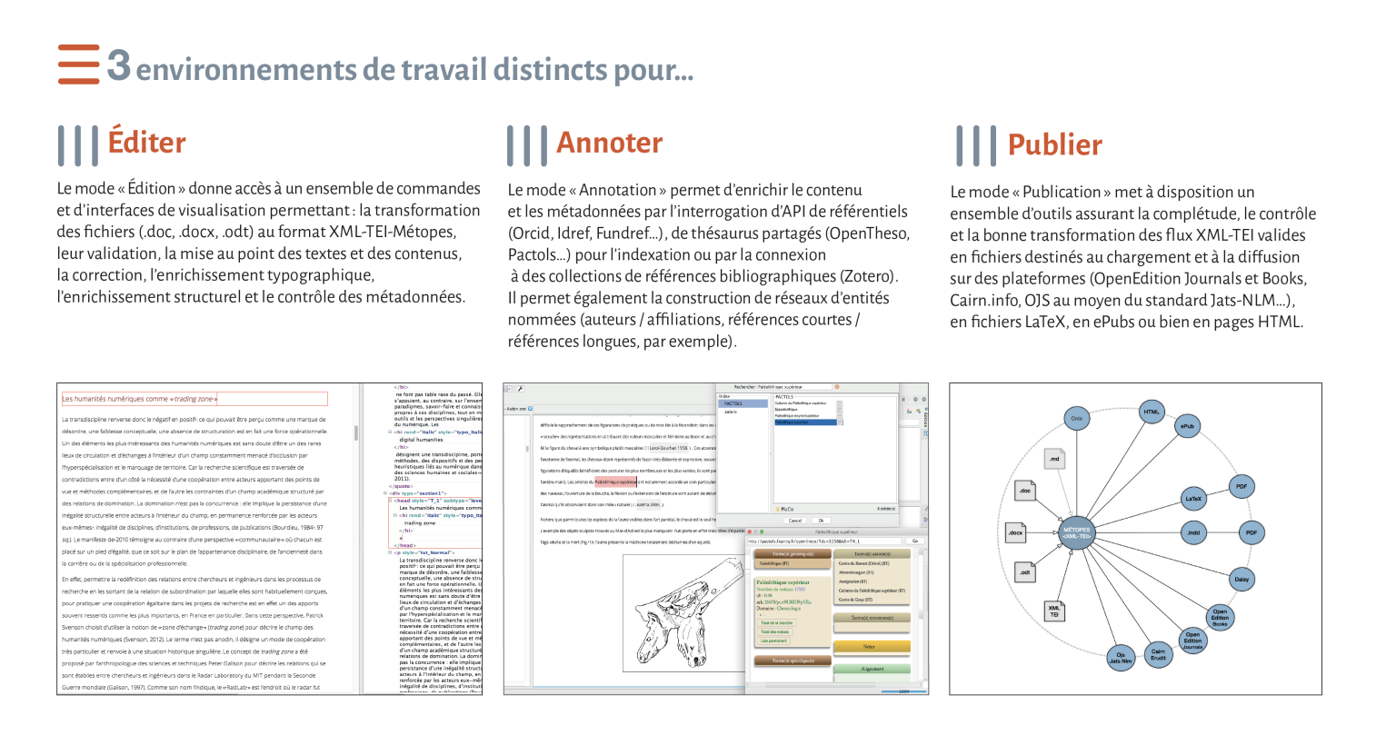 Le projet MÉTOPES « Méthodes et outils pour l’édition structurée »[1] vise à mettre au point, à développer et diffuser, librement dans la sphère publique, par des actions de formation auprès des éditeurs publics et des revues labellisées CNRS un ensemble d’outils et de méthodes leur permettant d’organiser leur production et leur diffusion papier et numérique dans un environnement normé à fort potentiel d’interopérabilité sur le modèle du Single Source Publishing[2]. Un des apports principaux est de rationaliser et de factoriser, au sein de la communauté des éditeurs universitaires et de recherche publics, le travail éditorial tout en favorisant la mise en place de stratégies de diffusion multisupports, en assurant une pérennisation des contenus et une haute qualité des métadonnées associées.
